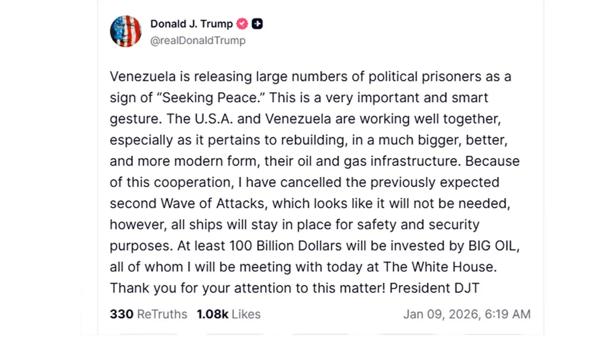 En su cuenta en "Truth", la red social que creó cuando cancelaron su cuenta en X, escribió: "Venezuela está liberando un gran número de presos políticos como una señal de ‘búsqueda de la paz’. Este es un gesto muy importante e inteligente. Estados Unidos y Venezuela están trabajando bien juntos, especialmente en lo que respecta a reconstruir, de una forma mucho más grande, mejor y más moderna, su infraestructura de petróleo y gas. Debido a esta cooperación, he cancelado la segunda ola de ataques que se esperaba, la cual parece que no será necesaria; sin embargo, todos los barcos permanecerán en su lugar por motivos de seguridad y protección. Al menos 100 mil millones de dólares serán invertidos por las grandes petroleras (“BIG OIL”), con quienes me reuniré hoy en la Casa Blanca. ¡Gracias por su atención a este asunto! Presidente DJT.”