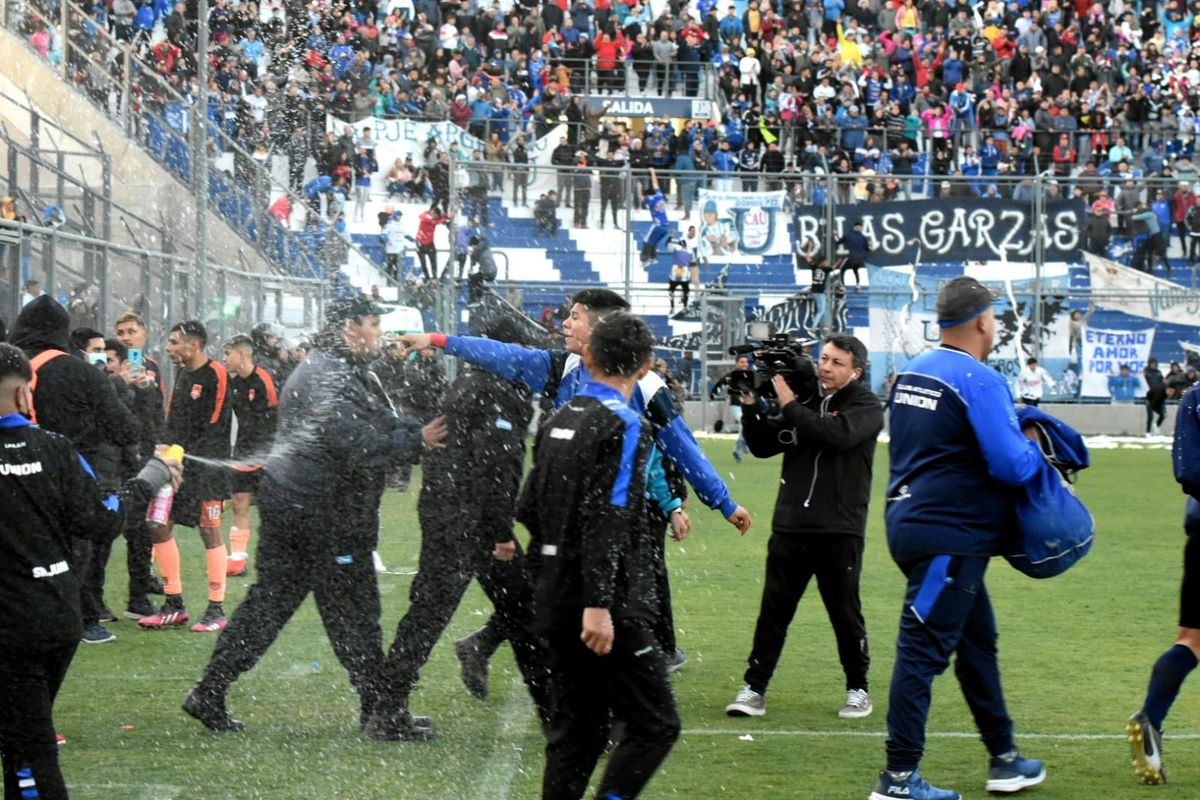 Según informaron los espectadores, la hinchada de Unión cruzó la tela de la tribuna tras finalizar el partido y se metió en el campo de juego. Allí, muchos de ellos le sacaron la ropa a los jugadores que quedaron en la cancha.