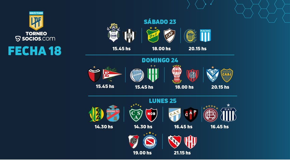 La 18ª fecha de la Liga Profesional de Fútbol se completará este lunes con 6 partidos. El líder River y el escolta Talleres de Córdoba saldrán a la cancha en el cierre de la jornada.