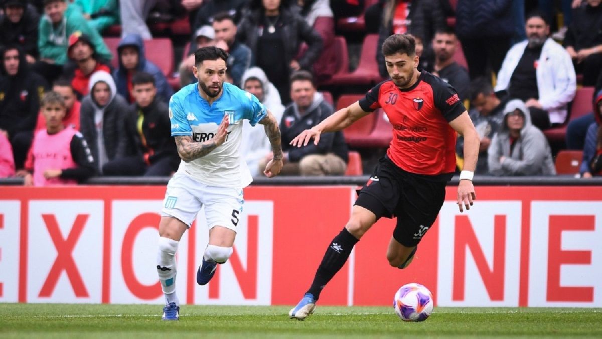 El primer tiempo fue de ida y vuelta, con ritmo y dinámica. Bien Racing con la pelota, a partir del fino toque de Vecchio y del dominio del mediocampo de Miranda y Moreno, más algunas buenas incursiones de Carbonero, con Copetti pivoteando entre los centrales rojinegros, bien marcado por Garcés.