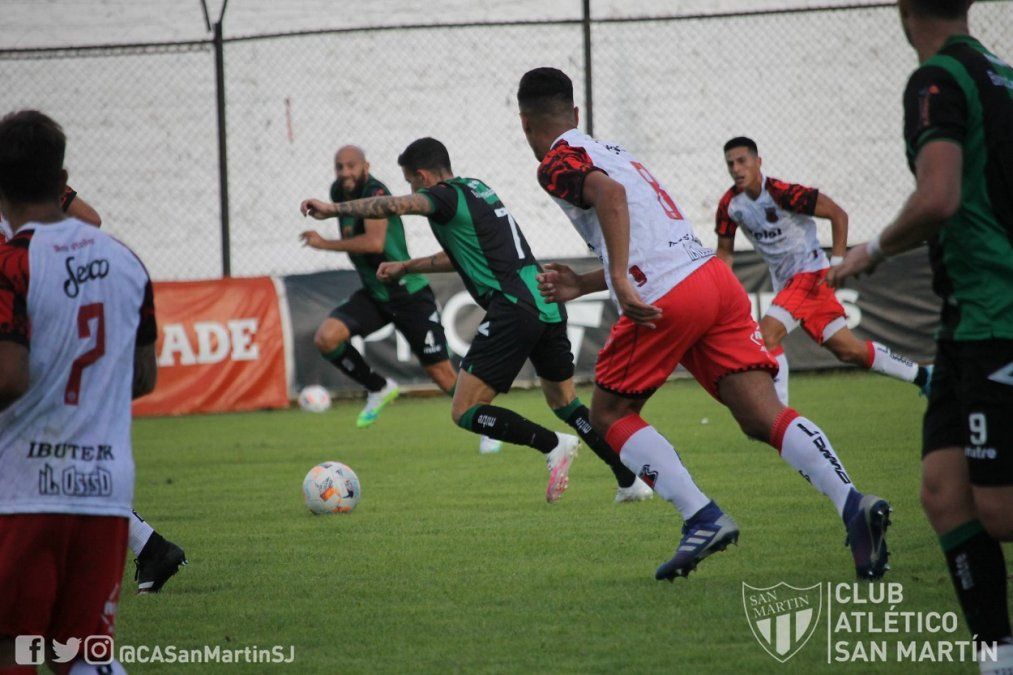 El encuentro se desarrolló en el estadio estadio Juan Pasquale, desde las 16.El encuentro lo abrió el equipo local con un gol de Alejandro Martínez, a los 20 minutos del primer tiempo. Una primera parte en la que el Verdinegro peleo, pero sin poder llegar al arco rival. En el complemento, el equipo sanjuanino buscó y buscó hasta que a los 39´, Lucas Campana encontró el empate.