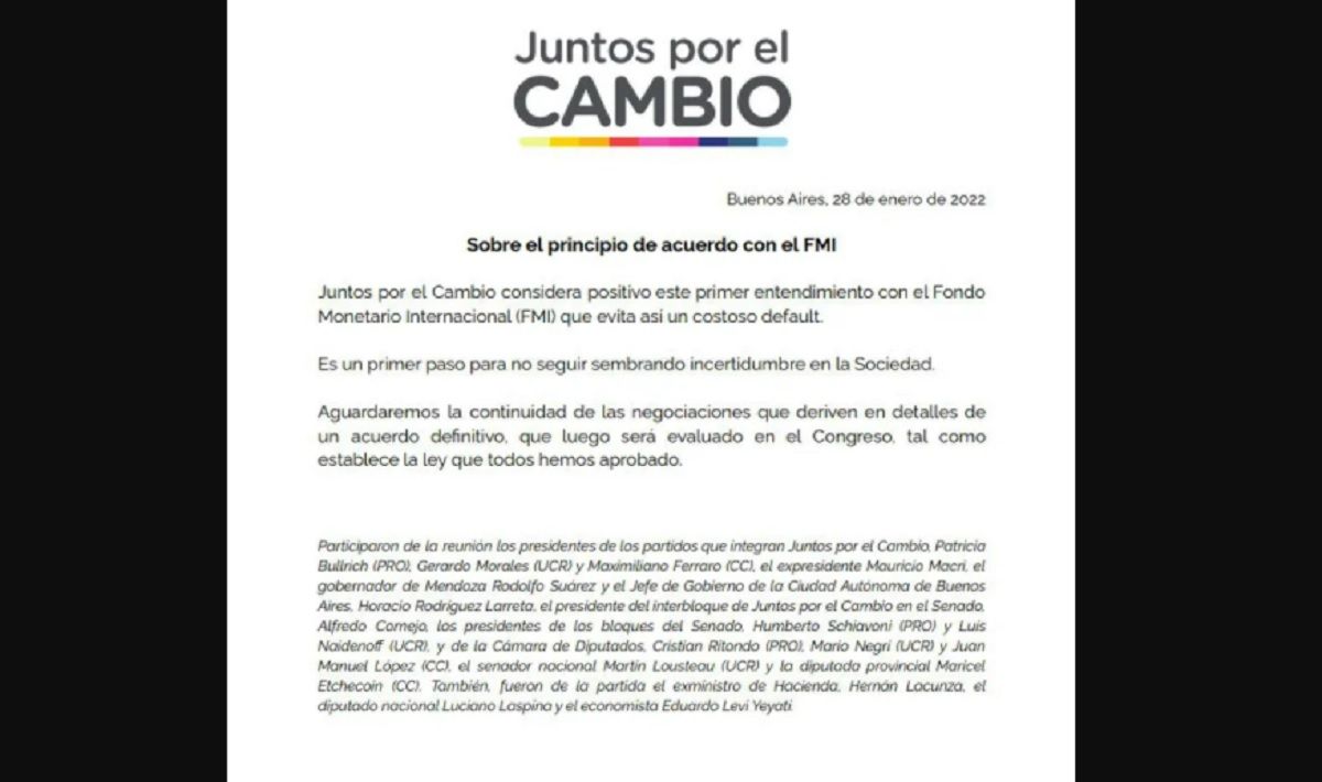 La Mesa Nacional de Juntos por el Cambio consideró esta tarde “positivo” el acuerdo del Gobierno con el Fondo Monetario Internacional (FMI) porque “evita un costoso default” y lo calificó de “primer paso para no seguir sembrando incertidumbre en la sociedad”.