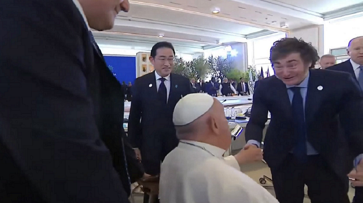 El papa Francisco, invitado especial de Giorgia Meloni a la cumbre del G7, se encontró con el presidente argentino, Javier Milei y se dieron un abrazo. Intercambiaron unas breves palabras, con sonrisas.