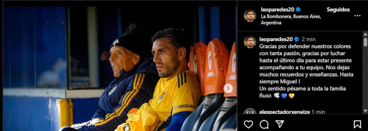 El volante compartió varias fotos y escribió: "Gracias por defender nuestros colores con tanta pasión, gracias por luchar hasta el último día para estar presente acompañando a tu equipo. Nos dejas muchos recuerdos y enseñanzas. ¡Hasta siempre Miguel! Un sentido pésame a toda la familia Russo".
