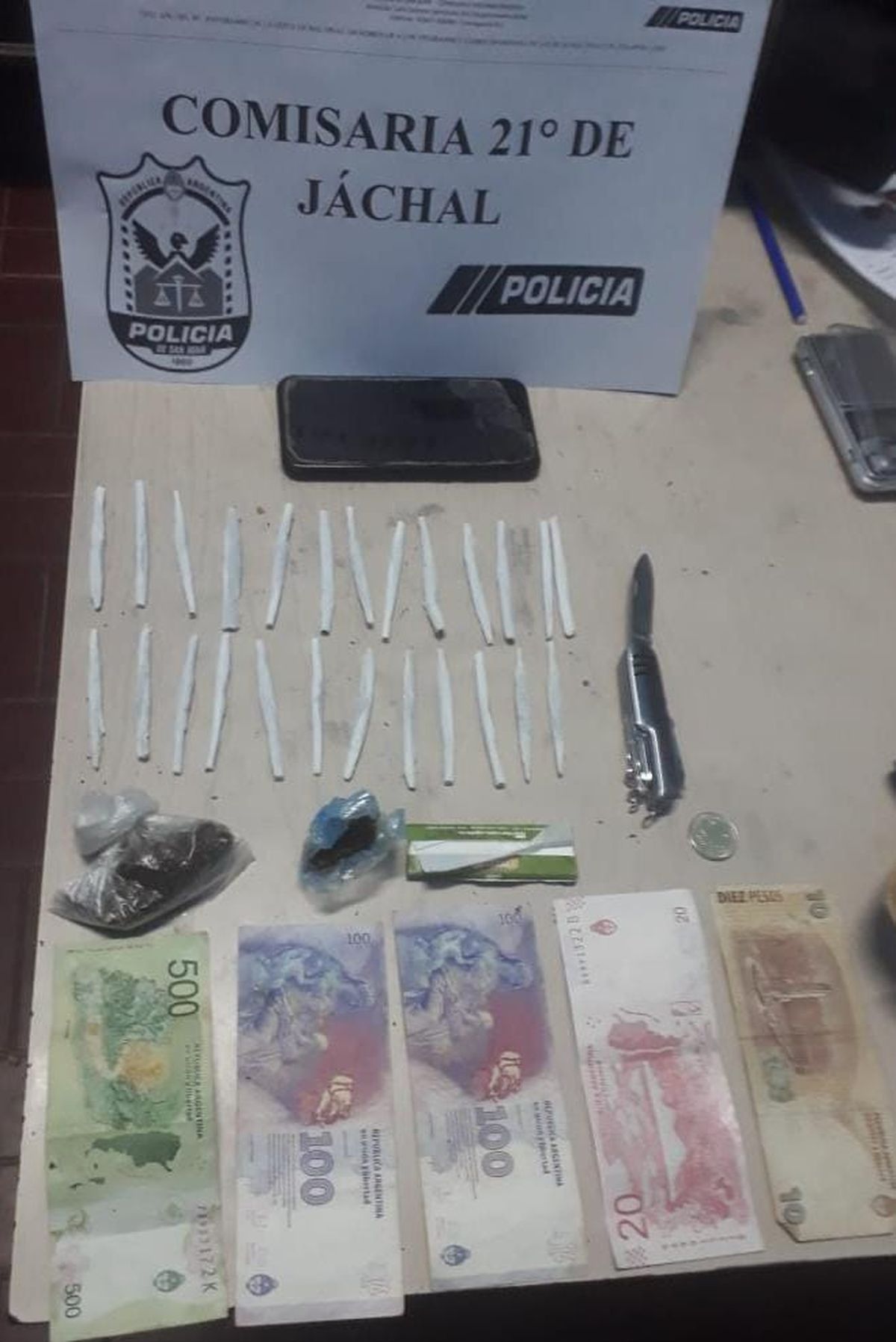 Personal policial informó que en circunstancias que realizaba recorridas de prevención por ex Ruta 40 en la localidad de Niquivil, Jáchal, entrevistó a dos hombres, y les secuestró una corta pluma de color plateada, una mochila, 25 cigarrillos armados y dos envoltorios que contenía sustancia vegetal de fuerte aroma.