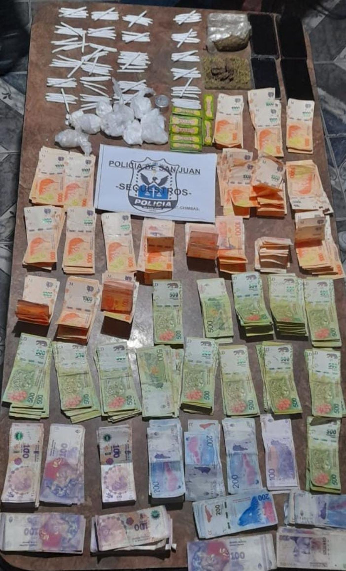 En el interior de esta vivienda, la Policía realizó una requisa que llevó al hallazgo de marihuana y cocaína. Se incautaron aproximadamente 1.250 cigarrillos armados (porros), alrededor de 300 gramos de marihuana compactada en diversas bolsas de nylon y 260 gramos de cogollo. Además, se encontraron aproximadamente 75 dosis de cocaína en bolsas de nylon negro, junto con alrededor de 250 gramos de cocaína compactada en distintas bolsas. En el lugar también se incautaron cuatro teléfonos celulares pertenecientes a los residentes de la vivienda y una suma considerable de dinero en efectivo.