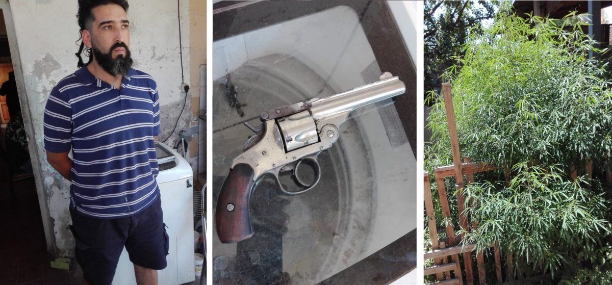 Los policías hicieron una requisa y hallaron un revolver calibre 38 escondido en un lavarropas y en el patio se toparon con una plantación de marihuana. Además encontraron pipas, trituradora de hojas y porros, por lo que intervino el Departamento de Drogas Ilegales.