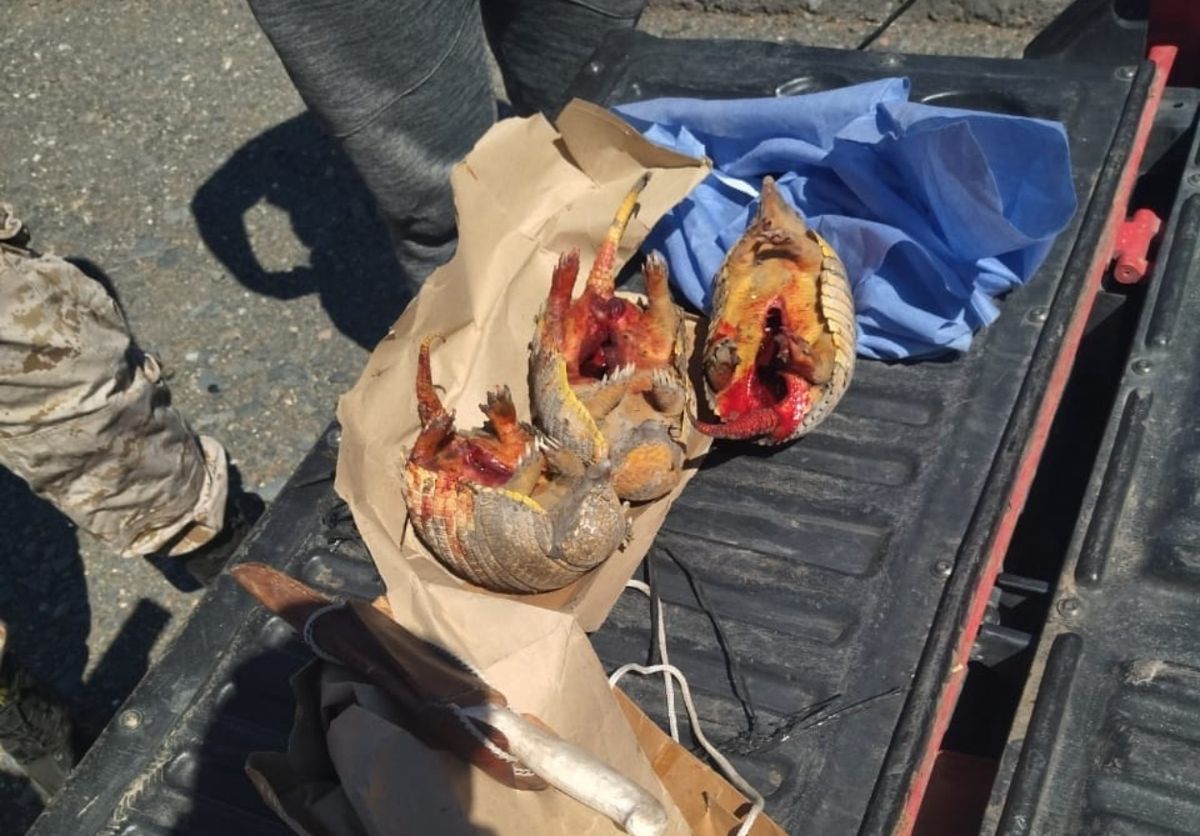 Según fuentes policiales, un sujeto de apellido Ozan circulaba en una camioneta marca Volkswagen, modelo Saveiro, a la cual se le secuestra tres animales, nombre vulgar Tatú carreta o Armadillo gigante.