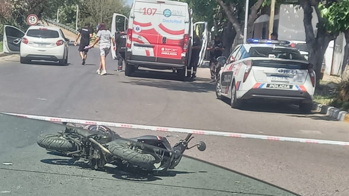 Según informaron las fuentes, el siniestro vial ocurrió en inmediaciones de avenida Libertador General San Martín y lateral de avenida Circunvalación. Por causas que se investigan, un Peugeot 308 blanco impactó con una moto en el cruce.