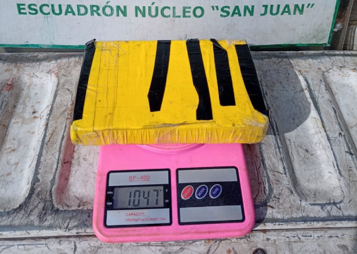 Durante la inspección, el personal del Escuadrón Núcleo “San Juan” detectó que el sujeto llevaba dentro de su equipaje de mano, un paquete “tipo ladrillo” que contenía una sustancia blancuzca.