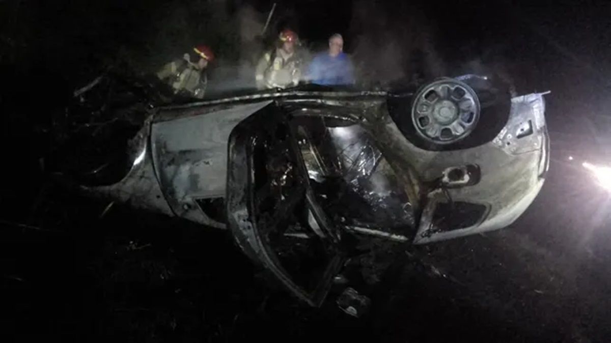 Al llegar al lugar, personal de bomberos se encontró con un auto en llamas, tras apagarlo la tarea fue enfriar la carrocería para permitir el retiro de los cuerpos.