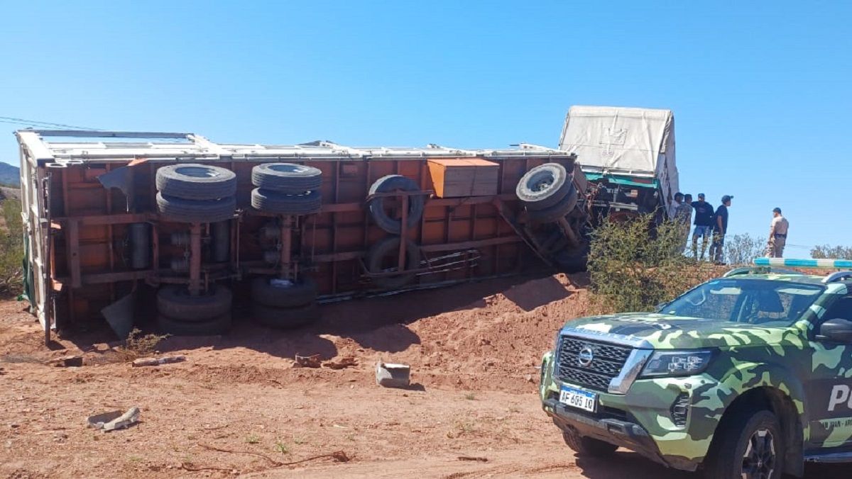 El camión volcó en ruta 141, en la Cuesta de Marayes, Caucete. El chofer no sufrió lesiones e gravedad, solo algunos golpes.