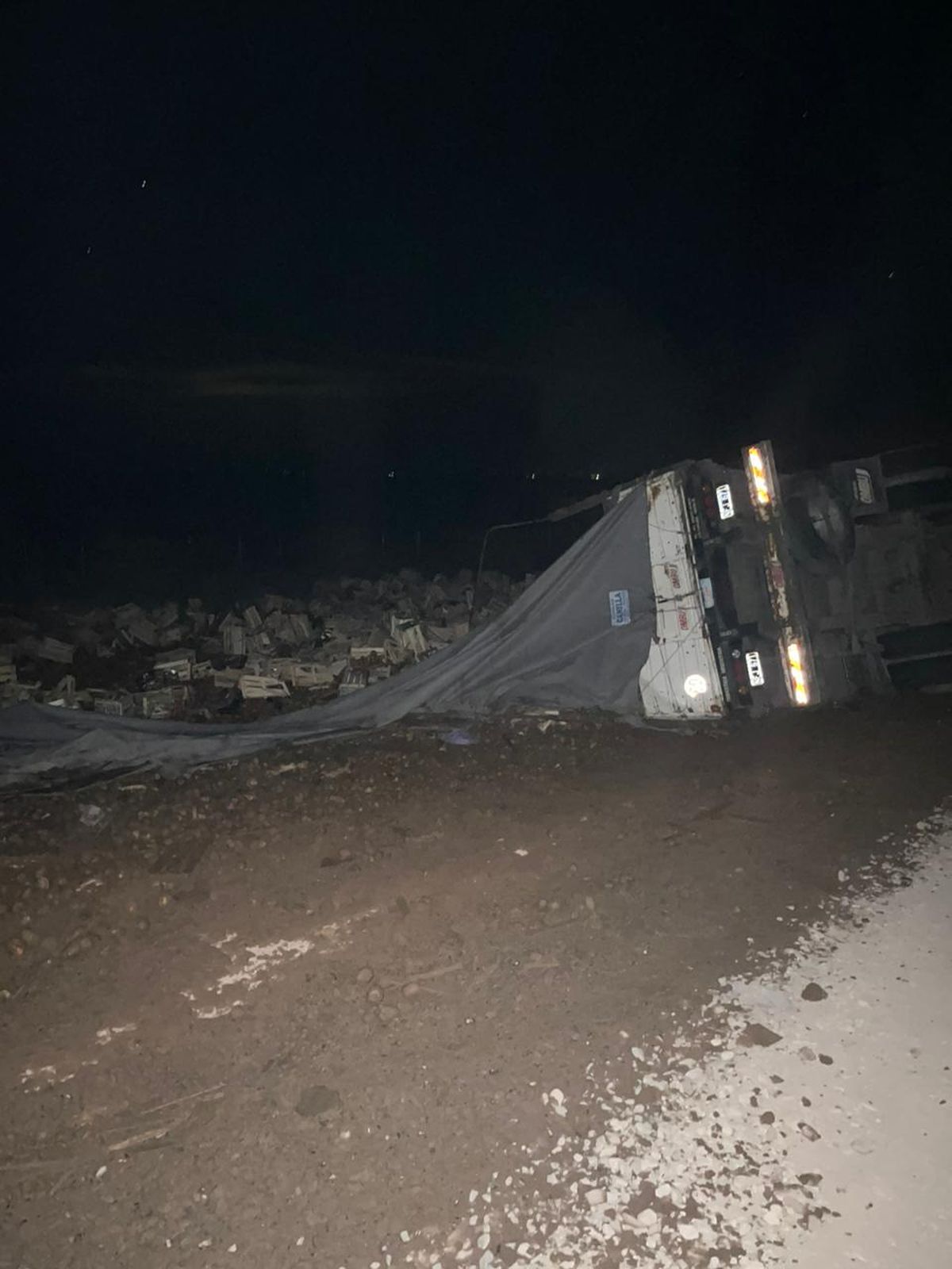 El conductor perdió el control del rodado y terminó de lado. En el costado de la ruta quedó toda la carga de tomate que trasladaba.