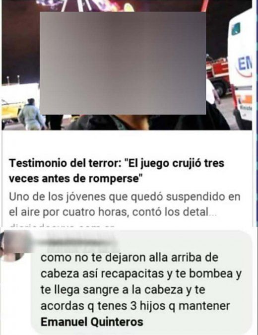 "El juego crujió tres veces antes de romperse", dijo Emanuel. Lo que jamás imaginó es que una mujer, tía materna de sus hijos le respondería de la peor manera. "Como no te dejaron allá arriba de cabeza así recapacitas y te acordás que tenés tres hijos que mantener", escribió la chica en las redes sociales. Luego de algunas horas el mensaje ya había llegado a varios grupos de Whasap.