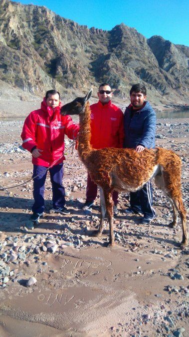 El guanaco pudo ser salvado antes de ahogarse en las frías aguas del lago. El animal logró recuperarse y se puso de pie junto a sus rescatistas.