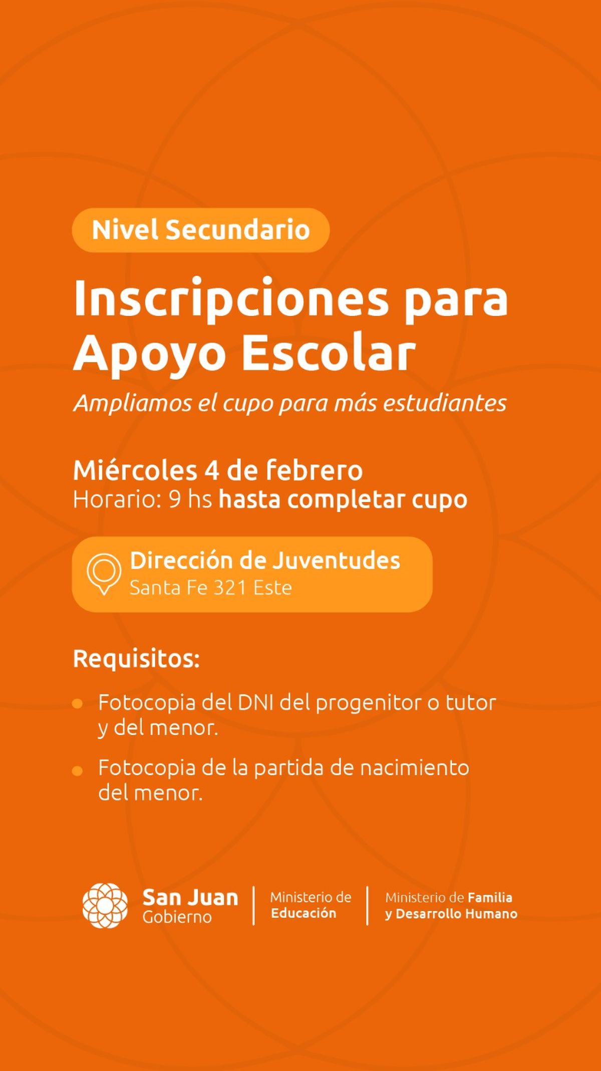 El Gobierno de San Juan, mediante el trabajo conjunto del Ministerio de Educación y el Ministerio de Familia y Desarrollo Humano, habilitó nuevas vacantes para el programa de Apoyo Escolar de Nivel Secundario. A continuación, los detalles para realizar el trámite: