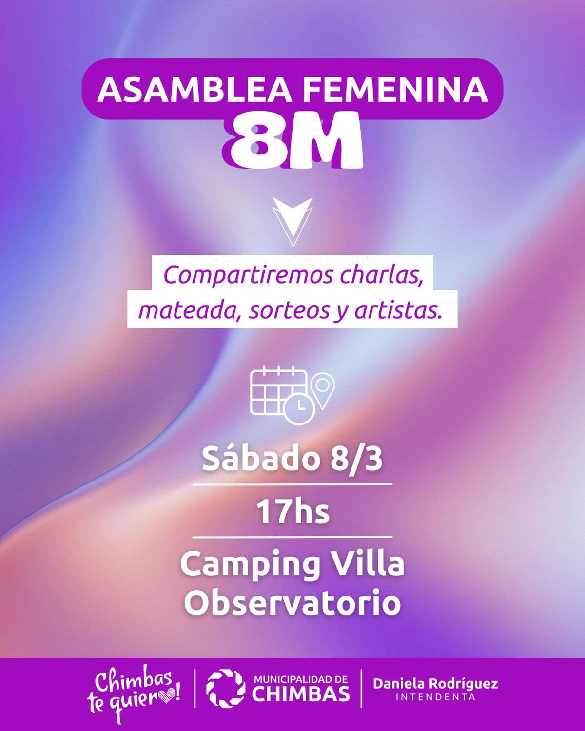 Este sábado 8 de marzo, desde las 17 hs, en el Camping de Villa Observatorio, se realizará la Asamblea Femenina 8M para conmemorar un día de suma importancia como lo es el Día de la Mujer. Allí se brindarán charlas y abordarán temáticas, creando un espacio para el debate y la concientizacion. La convocatoria es para mujeres de todas las edades y actividades con el objetivo de construir una red de contención y participación activa.