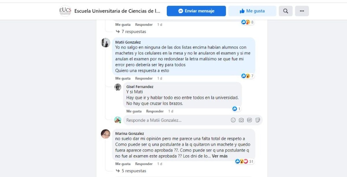 “Me parece una falta de respeto todo lo que ha sucedido en estas mesas de exámenes. Alumnos que se prestaban calculadora con machetes, celulares arriba de los bancos, gente que fue a rendir sin su DNI y de ahí muchas injusticias más. Mi nombre figura la lista de no ingresantes y el DNI no es mí número”, fue una de los cientos de comentarios que figura en el Facebook de la Escuela Universitaria de Ciencias de la Salud UNSJ.
