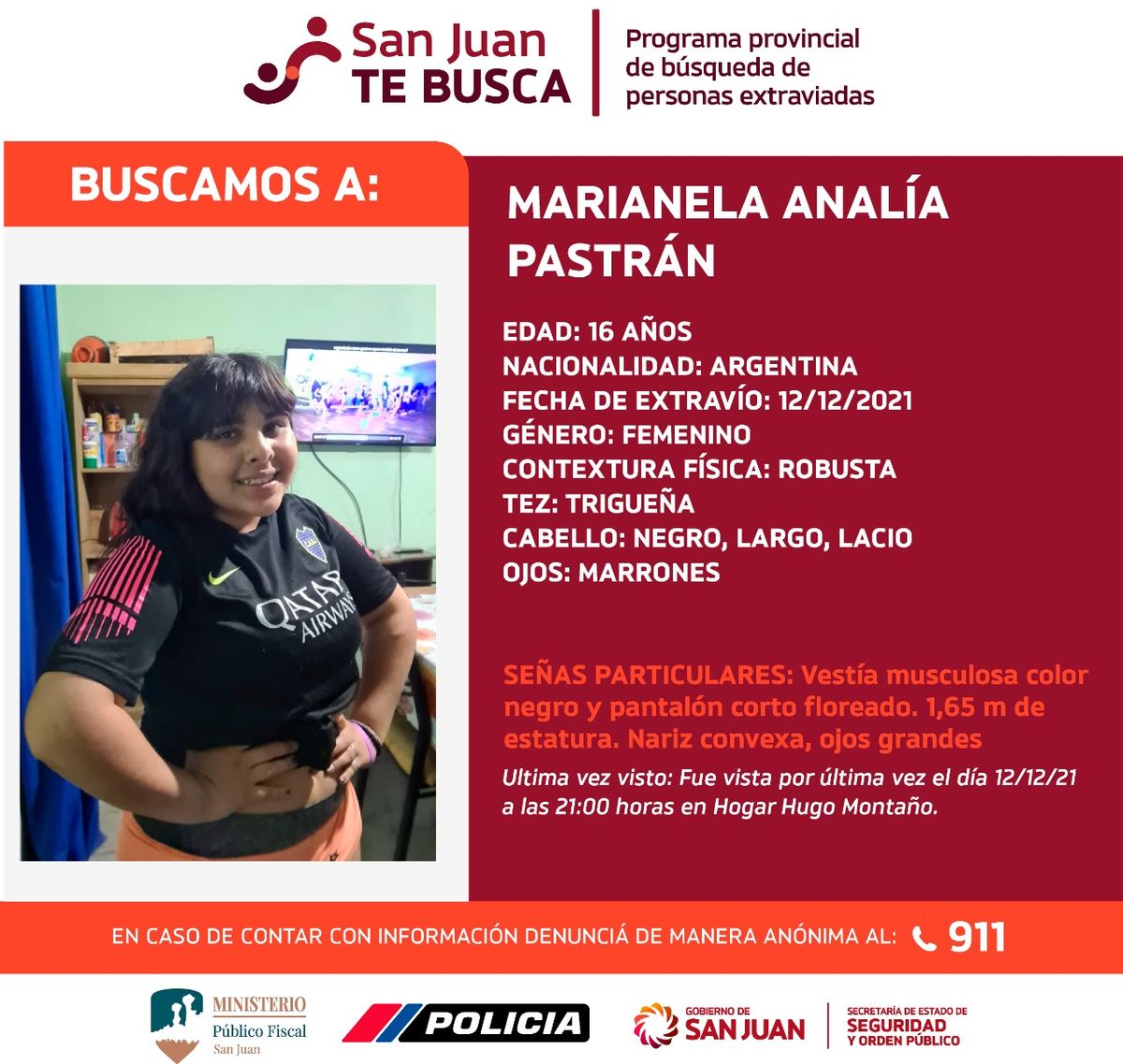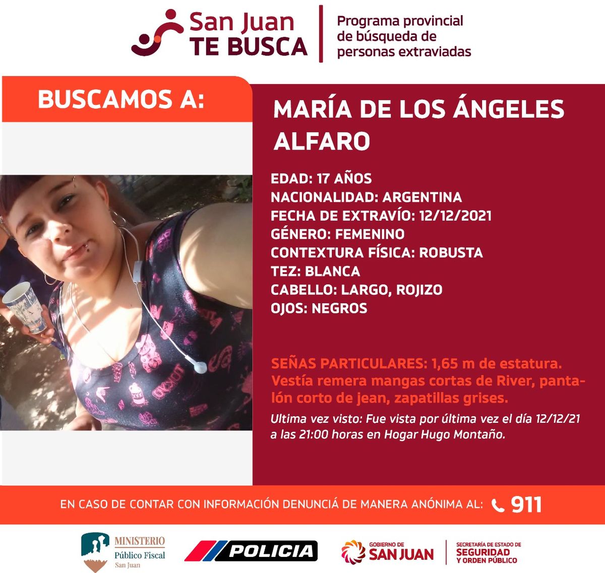 Este miércoles se activó nuevamente el programa provincial de búsqueda de personas extraviadas denominado San Juan Te Busca. En este caso, el objetivo que se persigue es dar con el paradero de tres adolescentes que fueron vistas por última vez el pasado domingo 12 de diciembre, alrededor de las 21 horas, en el Hogar Hugo Montaño.