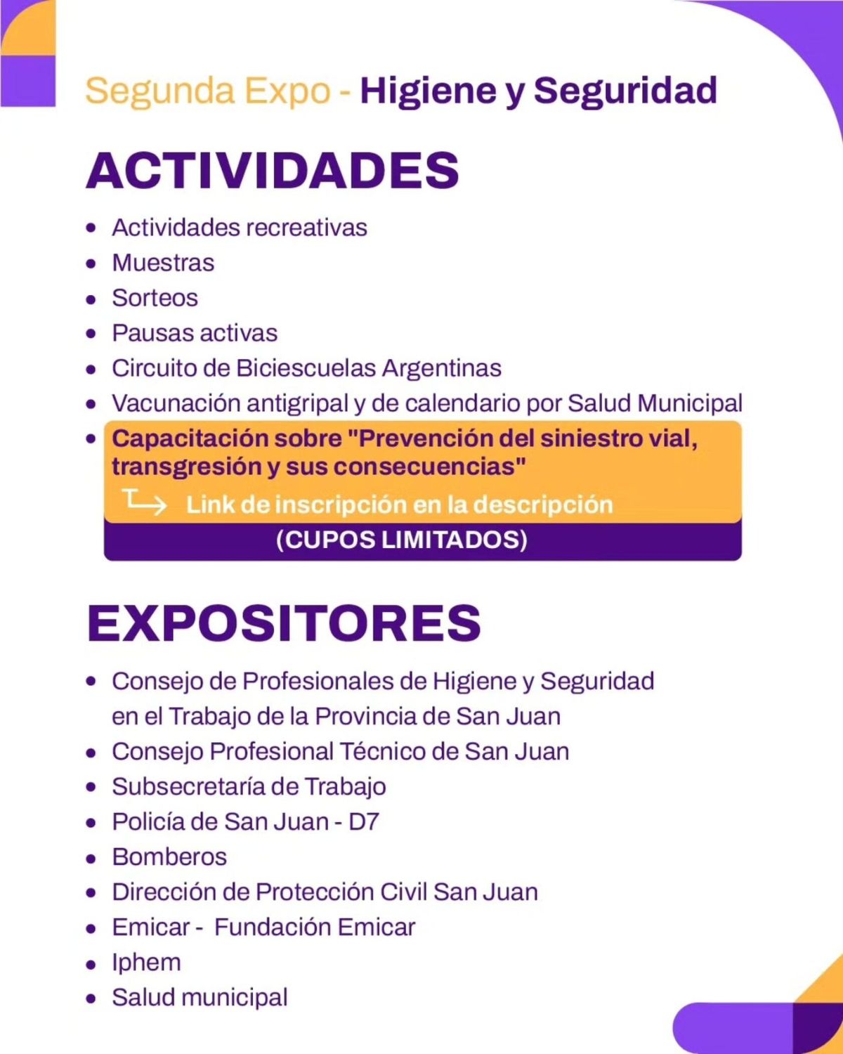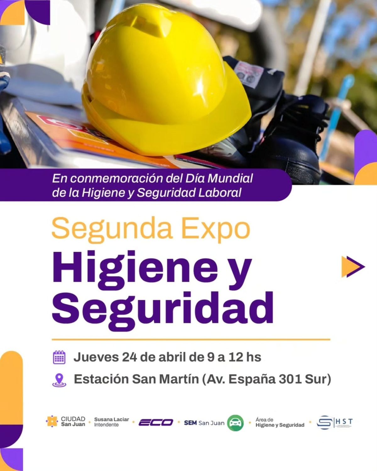 En el marco de la Semana de la Higiene y Seguridad Laboral, la Municipalidad de la Ciudad de San Juan realizará la 2ª Expo Higiene y Seguridad, que se llevará a cabo el jueves 24 de abril, de 9 a 12 en la Estación San Martín.