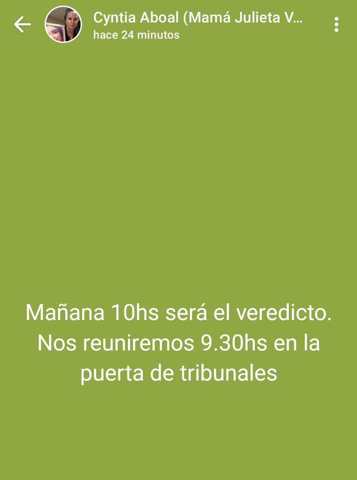 A pocas horas de que finalice el juicio contra el médico acusado por mala praxis en la atención de Julieta Viñales, su madre, Cintia, volvió a usar las redes sociales para enviar un mensaje de fuerza a su entorno y convocar a familiares y amigos a concentrarse este viernes en la puerta de Tribunales, donde se conocerá la sentencia.