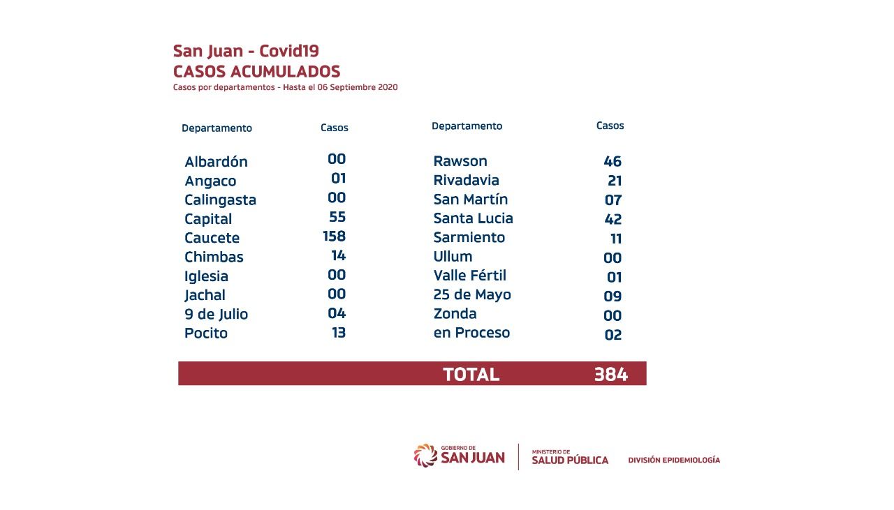Mónica Jofré, jefa de Epidemiología, dijo en conferencia de prensa durante la jornada del lunes, que San Juan actualmente tiene 384 casos positivos de COVID-19 acumulados. La funcionaria, a través de un gráfico que expuso en la videoconferencia, detalló que Caucete y Capital son los dos departamentos con más casos positivos.
