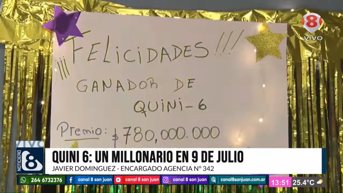Con globos, cotillón y un cartel de felicitaciones, en una agencia de 9 de Julio esperan al sanjuanino que acertó los seis números del Quini 6 y se llevó un premio de $780 millones.