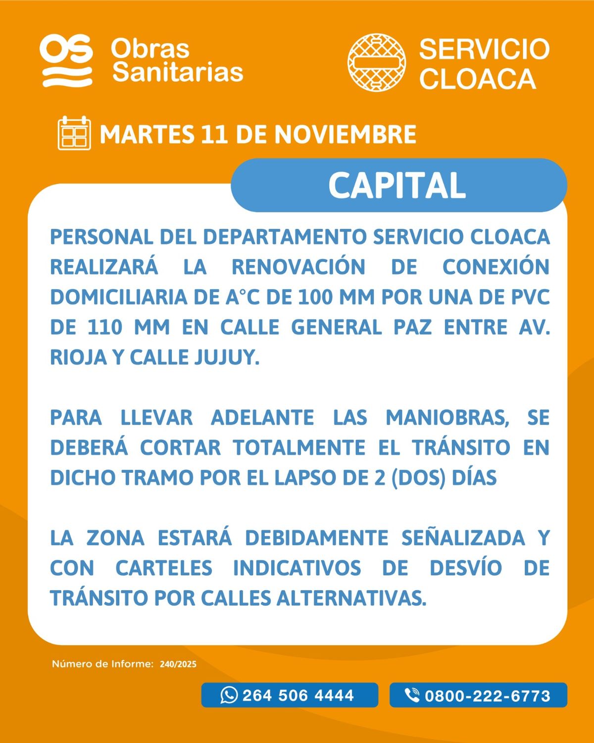 La Municipalidad de la Ciudad de San Juan informó que este martes 11 de noviembre se iniciarán trabajos de renovación de conexión domiciliaria en calle General Paz, en el sector comprendido entre avenida Rioja y calle Jujuy.