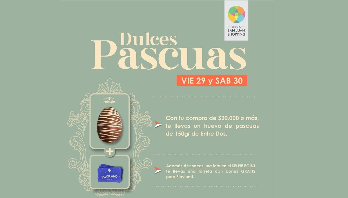 Con todas las compras de $30.000 (pesos treinta mil) o más, que realicen los clientes tanto de los locales, patio gastronómico o stands de Espacio San Juan, se les obsequiará 1 (un) huevo de Pascua de 150gr de la marca Entre Dos, hasta agotar stock.