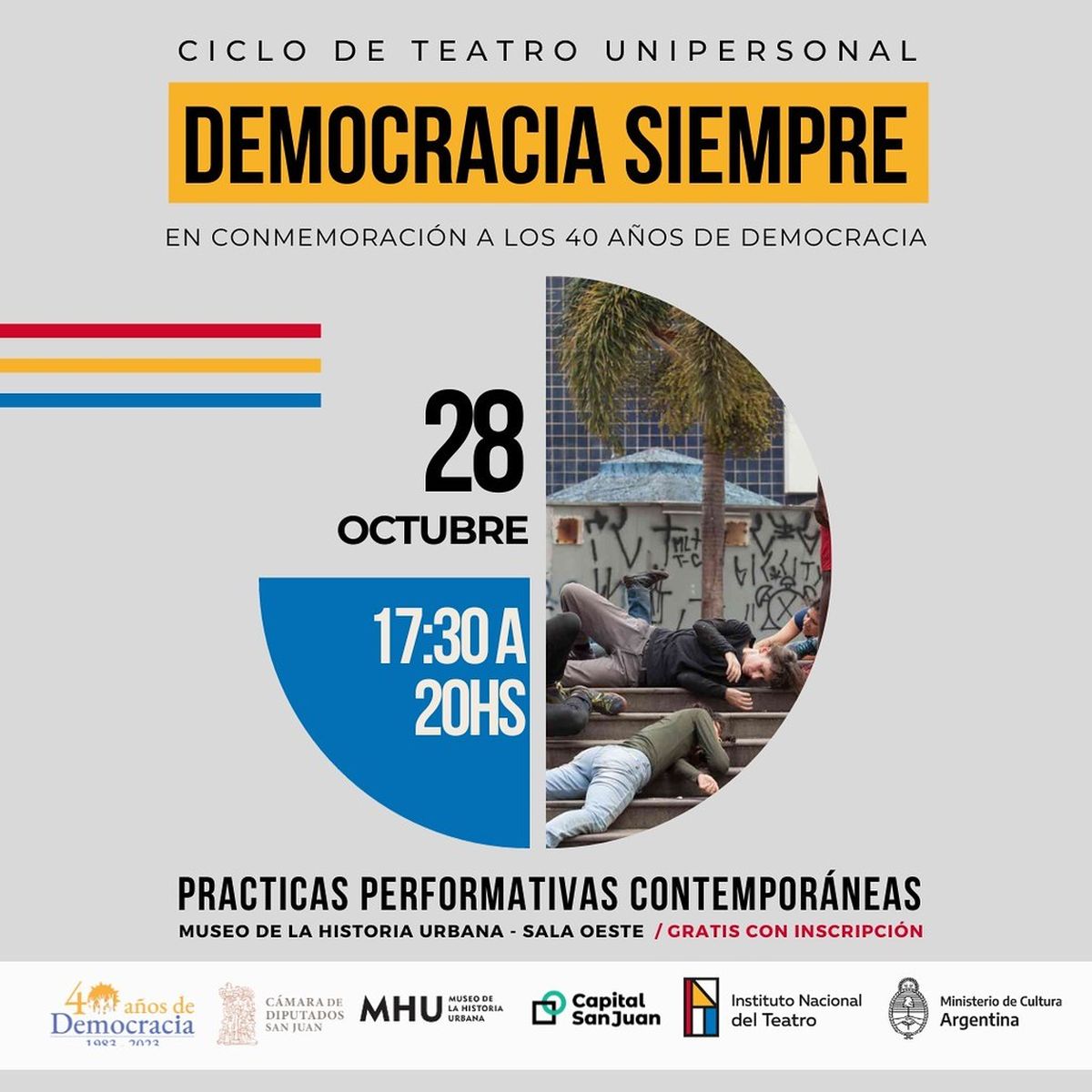 En el marco de la conmemoración por los 40 años ininterrumpidos de democracia en el país, la Cámara de Diputados de San Juan junto al Instituto Nacional del Teatro, llevarán a cabo, del 28 de octubre al 23 de noviembre, un Ciclo de Teatro Unipersonal que contempla cuatro funciones y un taller de formación en prácticas performativas bajo el lema “Democracia Siempre”.