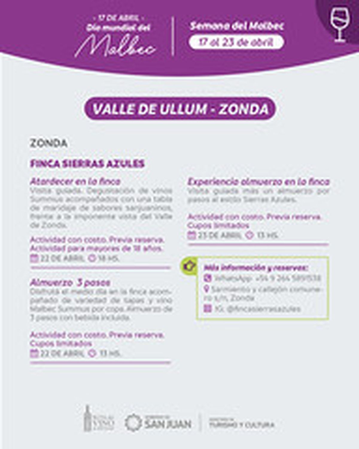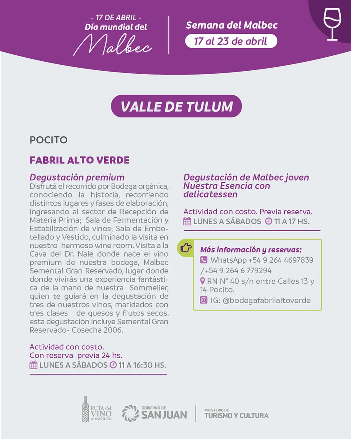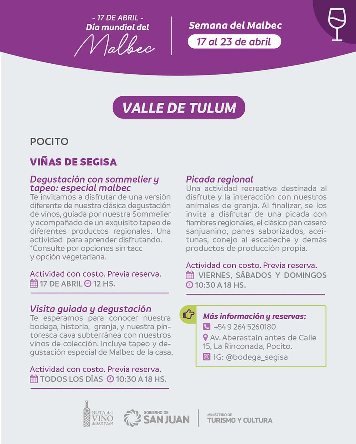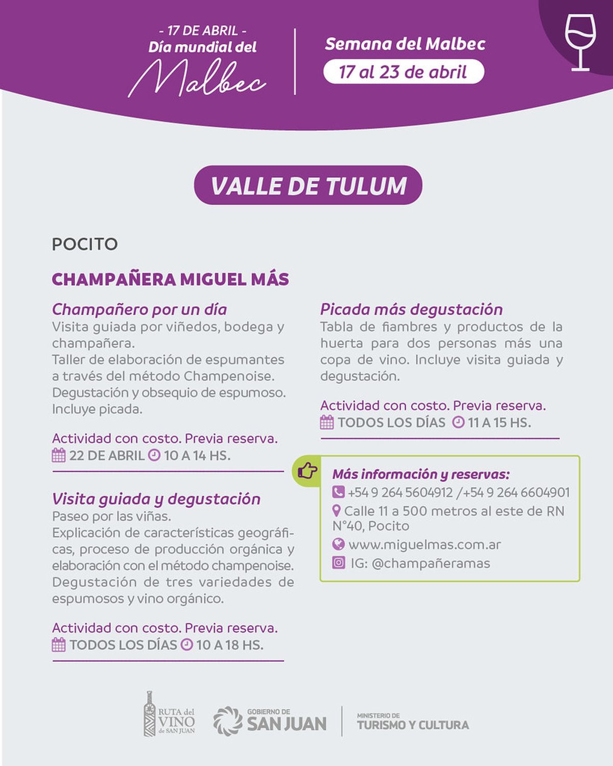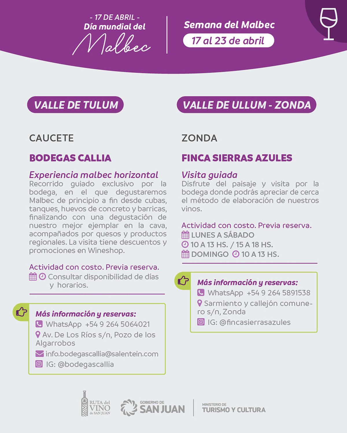 El Día Mundial del Malbec es actualmente celebrado en más de 60 ciudades del mundo a través de diferentes propuestas conmemorativas. En San Juan, con el apoyo del Ministerio de Turismo y Cultura, diferentes bodegas que integran la Ruta del Vino propondrán actividades para celebrar a lo largo de la semana.
