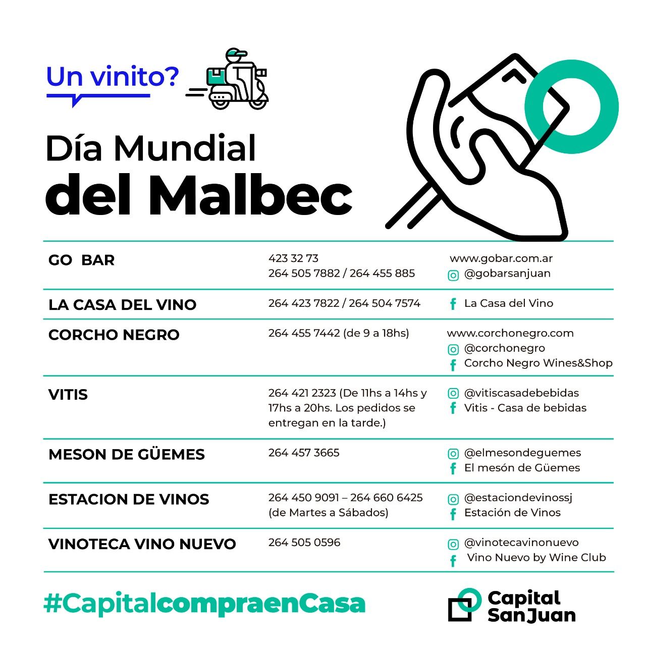 Hoy 17 de abril se celebra a nivel mundial el Día del Malbec y las vinotecas ubicadas en Capital se sumaron a una iniciativa de marketing que busca mover las ventas a casi un mes de la declaración de la cuarentena social, preventiva y obligatoria. Sandra Barcelo, secretaria de Cultura y Turismo, habló con sanjuan8.com y contó que esta iniciativa surgió del sector y ofrecen descuentos de hasta del 50% y delivery.