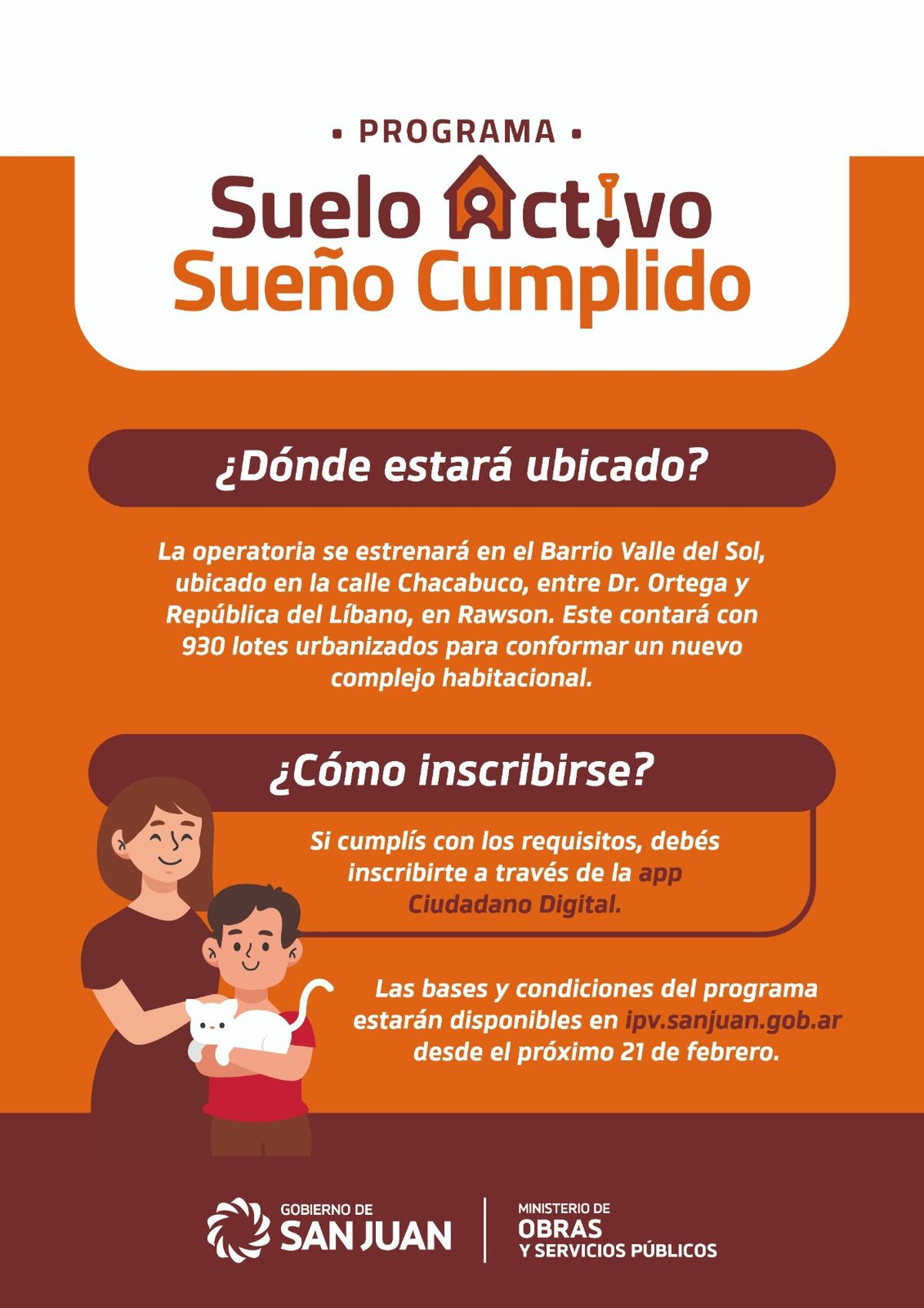 El programa atenderá a la necesidad de las familias sanjuaninas que no posean terreno ni vivienda. El objetivo es brindar la accesibilidad a un lote urbanizado con servicio de agua, gas y electricidad, más la asistencia financiera para construir la vivienda.