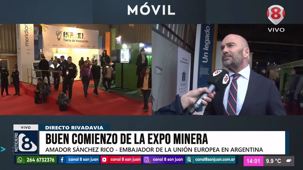 Este miércoles, en el segundo día de la Expo Minera, Noticiero 8 dialogó con el embajador de la Unión Europea en Argentina, Armando Sánchez Rico, quien se encuentra en la provincia por primera vez. El diplomático destacó que es un "gran placer" estar en San Juan y resaltó la presencia del órgano al que representa en la feria, la cual tildó como una "muestra clara del apoyo al sector en una provincia que es referente de la minería a nivel nacional y mundial".