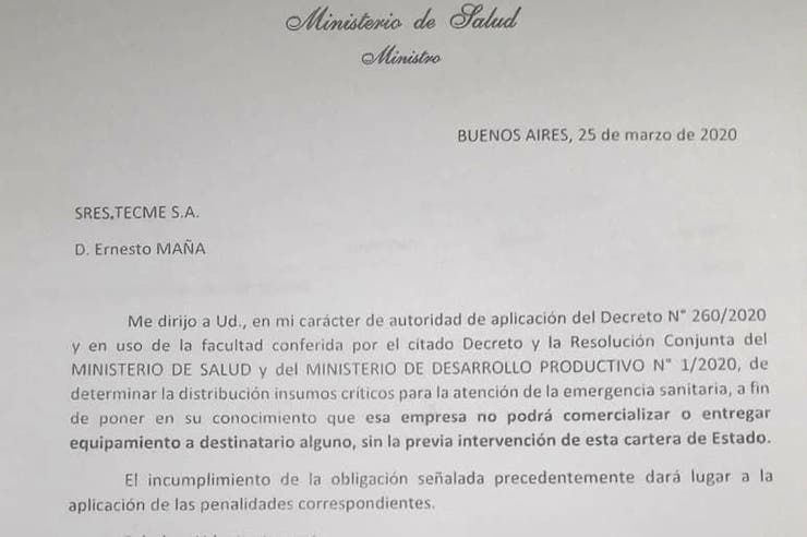 Se conoció públicamente que el ministro de Salud, Ginés González García le informó a la empresa Tecme que no podrá comercializar insumos críticos en el marco de la emergencia sanitaria.