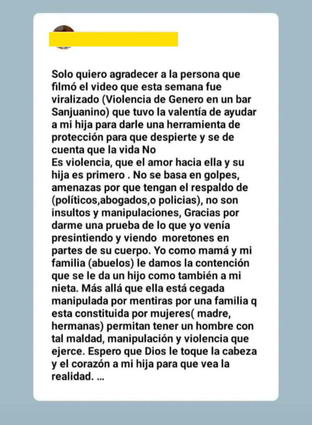 “Solo quiero agradecer a la persona que filmó el video y que tuvo la valentía de ayudar a mi hija para darle una herramienta de protección para que despierte y se dé cuenta que la vida no es violencia”, fue la primera oración de un texto que advierte que la mujer sospechaba que su hija estaba en una relación de violencia.
