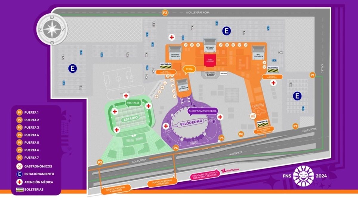 - Los automovilistas y motociclistas que circulen desde la zona Norte deberán dirigirse por Ruta Nacional 40, en dirección Sur. Al descender a la colectora Oeste en calle 7, girarán al Este. A pocos metros, encontrarán el ingreso a la puerta 1 de Calle 7.