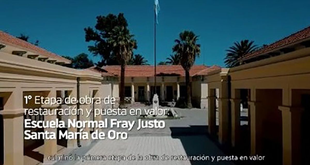 La primera etapa de la restauración de la escuela Normal Fray Justo Santa María De Oro, culminó con grandes resultados. En esta oportunidad se pusieron en valor 684 metros cuadrados correspondientes a cuatro aulas, galerías y sanitarios.