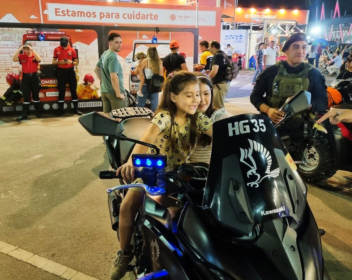 El stand de Seguridad fue uno de los puntos más concurridos por los más pequeños durante la jornada. Niños y niñas colmaron el espacio, atraídos por las motos del GERAS de la Policía de San Juan, un cuatriciclo de Bomberos y la zona de fotografía del Servicio Penitenciario de Chimbas.
