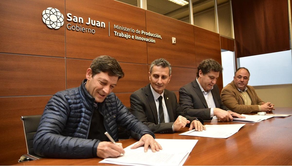 Los ministros Gustavo Fernández (de Producción, Trabajo e Innovación) y Carlos Platero (de Familia y Desarrollo Humano) junto al presidente Manuel Rodríguez (de la Agencia Calidad de San Juan) rubricaron la firma para la concreción de este importante convenio para el beneficio de las familias sanjuaninas.