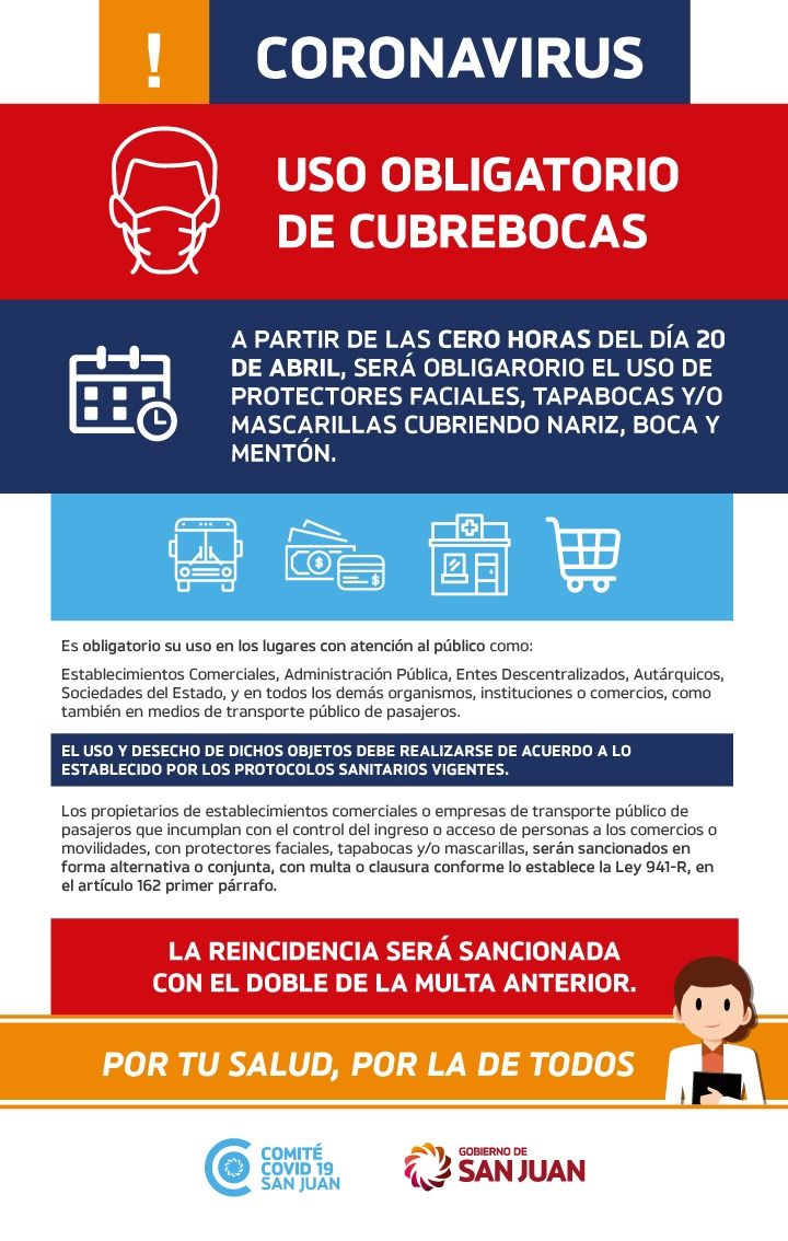 A través del Decreto Nº 560, con fecha 14/04/2020, el gobernador de San Juan, Sergio Uñac, dispuso la “obligatoriedad, desde las cero horas del día 20 de abril del 2020, del uso de protectores faciales, tapabocas y/o mascarillas cubriendo nariz, boca y mentón, en los lugares con atención al público y transporte público”.