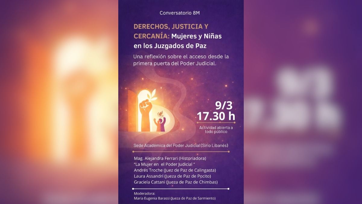 El Poder Judicial de San Juan desarrollará el conversatorio bajo el lema “Derechos, Justicia y Cercanía: Mujeres y Niñas en los Juzgados de Paz”. La actividad, organizada por la Corte a través de la Oficina de la Mujer, busca analizar la labor de los juzgados departamentales como la primera puerta de acceso a la justicia para las mujeres.
