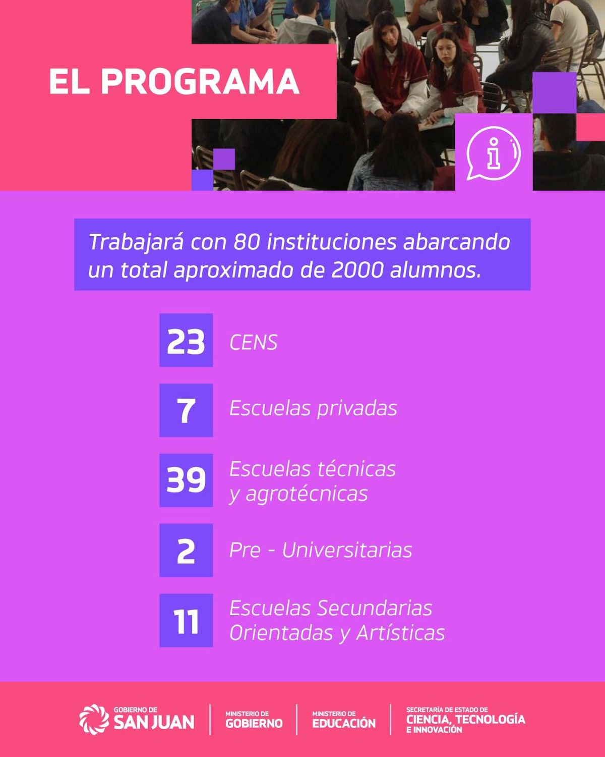 Cabe mencionar que el programa se desarrolla en el ámbito educativo formal y no formal provincial y tiene como objetivo la enseñanza de los pasos necesarios para comenzar un emprendimiento, basado en la importancia de la toma de decisiones y de las ventajas del trabajo en equipo.
