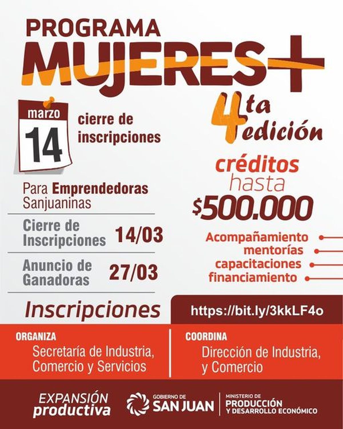 Las interesadas pueden anotarse a través de la página web de Agencia Calidad San Juan, completando un formulario y adjuntando la documentación requerida (link de inscripción: https://bit.ly/3m5Ylwo). Este programa está destinado a las mujeres sanjuaninas y busca generar capacidades empresariales, brindando conocimientos y acompañamiento técnico-profesional, a fin de lograr su desarrollo personal y laboral, como así también el fortalecimiento y sustantividad de sus empresas a través de una mayor competitividad.