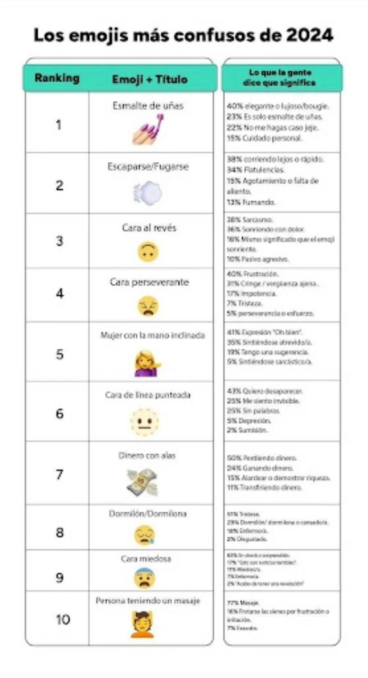 Aunque los emojis tienen nombres propios desde el momento de su creación, su uso está abierto a la interpretación. Ya sea por antecedentes culturales, normas sociales o influencias lingüísticas, las personas pueden darle diferentes significados al mismo emoji. Mientras que alguien puede interpretar tu como aprobación o acuerdo, otro puede tomarlo como una respuesta pasivo-agresiva o despectiva. El sondeo reveló, por ejemplo, que el 48% de las personas tuvieron contacto ha visto un emoji malinterpretado que creó una situación incómoda.