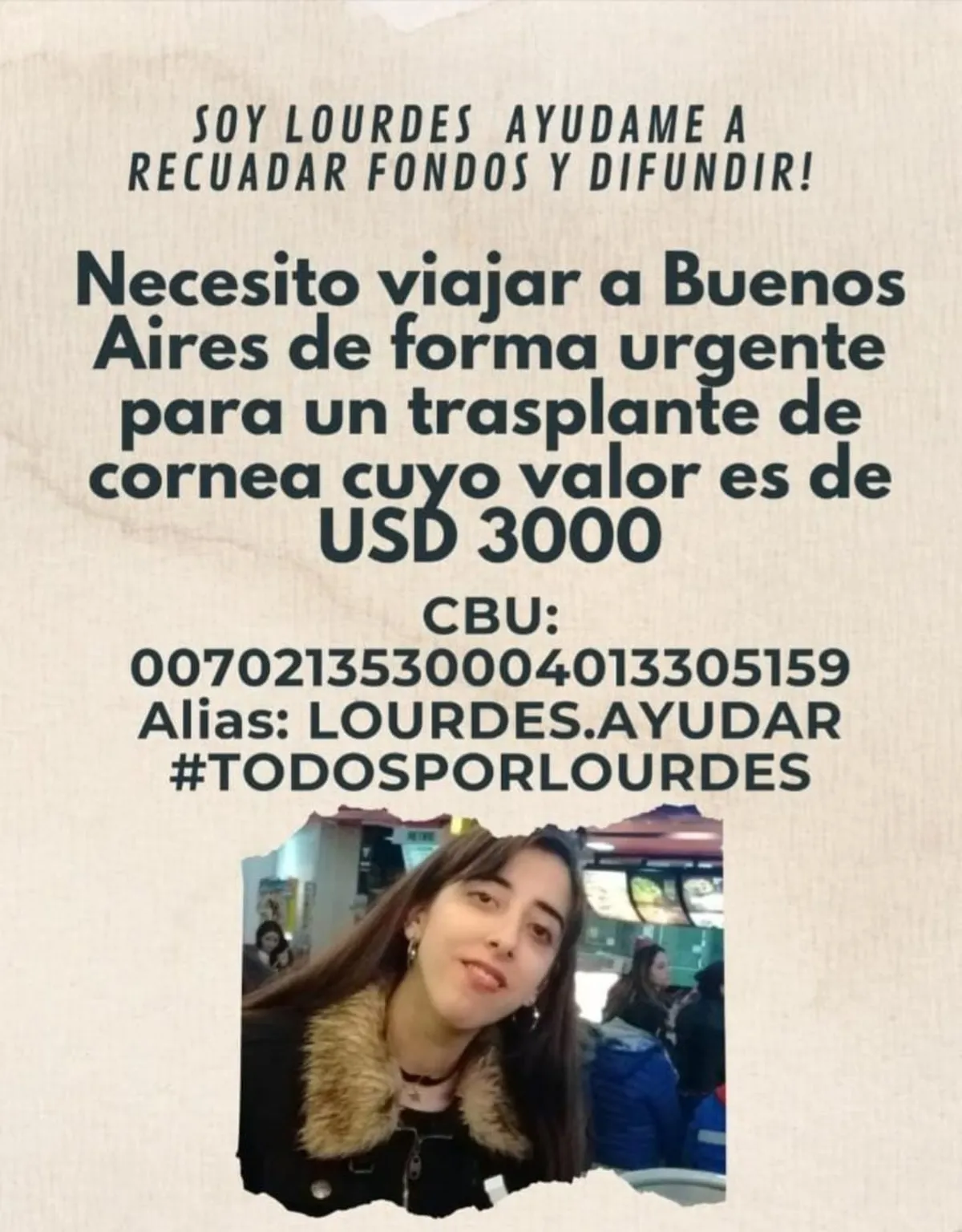 Lourdes fue intervenida varias veces cuando cursaba su secundaria, pero ninguna de las operaciones fue exitosa y sus médicos le sugirieron la posibilidad de un trasplante de corneas. El problema es que la operación tiene un costo de 3 mil dólares y su familia no cuenta con el dinero.