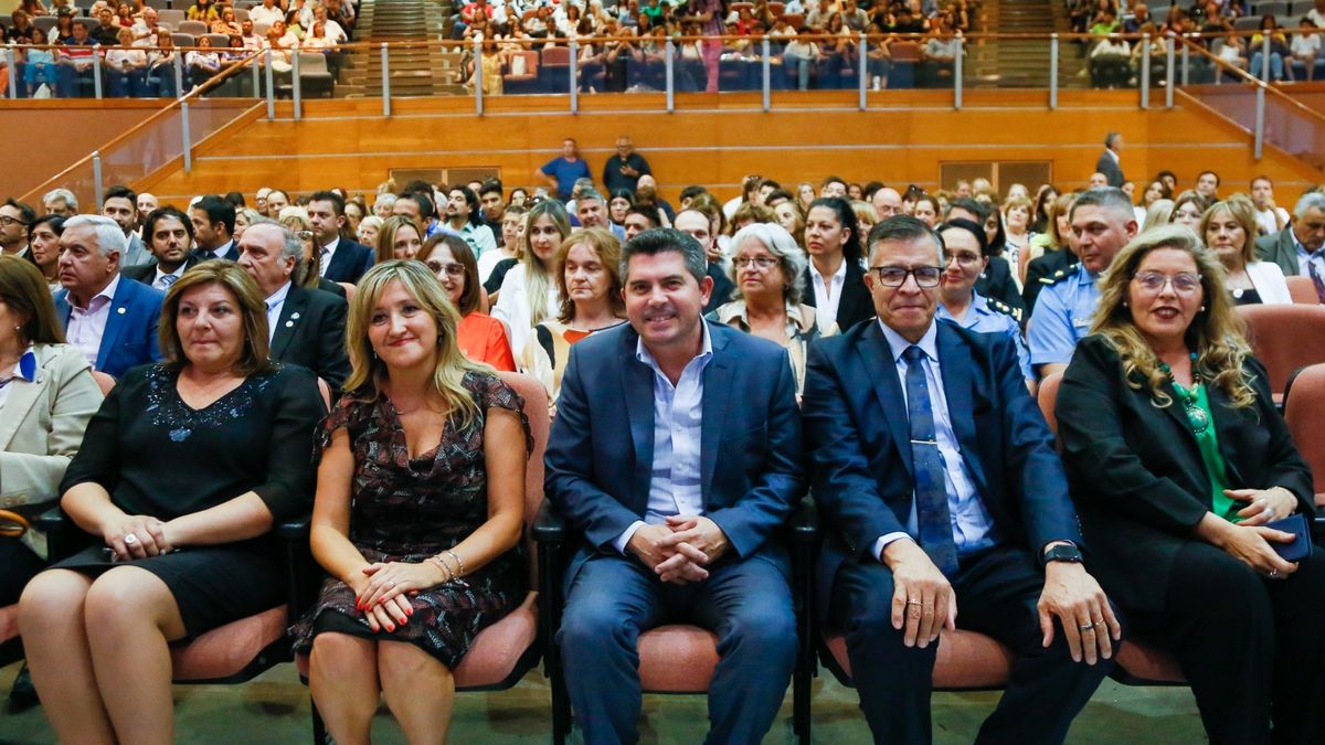 El acto se desarrolló en el centro de convenciones Guillermo Barrena Guzmán y participaron además del gobernador, el secretario de seguridad Gustavo Federico Sánchez, rector de la UNSJ Tadeo Berenguer, vicerrectora Analía Ponce, rectora de la Universidad Católica de Cuyo María Laura Simoneci, secretario general de AMET Daniel Quiroga, supervisoras, supervisores, docentes, familiares.