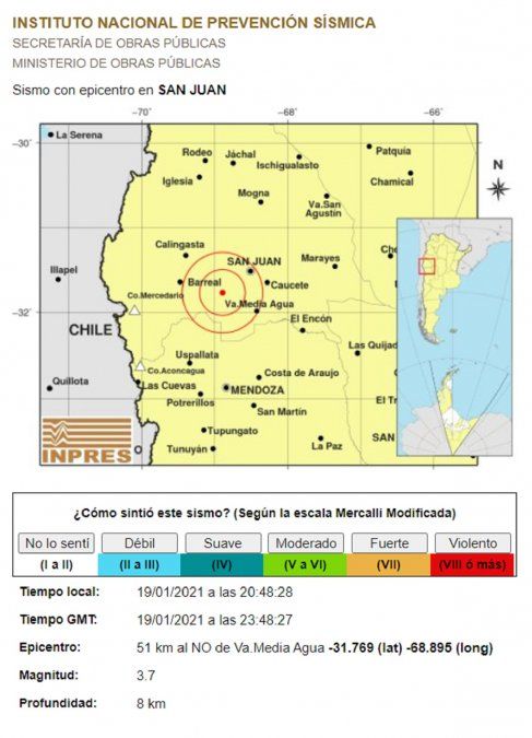 De acuerdo a lo informado por el Instituto Nacional de Prevención Sísmica (INPRES), el epicentro del temblor se registró a 51 kilómetros al NO de Media Agua, en el departamento de Sarmiento.