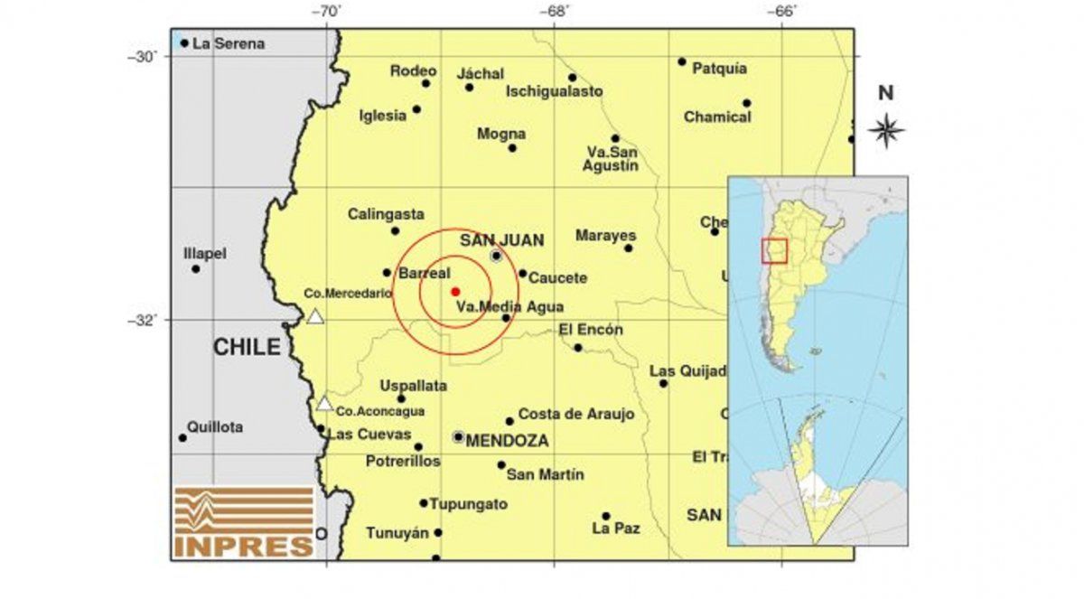 El INPRES informó que el epicentro fue a 46km al SO de San Juan y 48km al NO de Va.Media Agua (-31.790 (lat) -68.870 (long)). El nuevo sismo tuvo una profundidad de 7km.