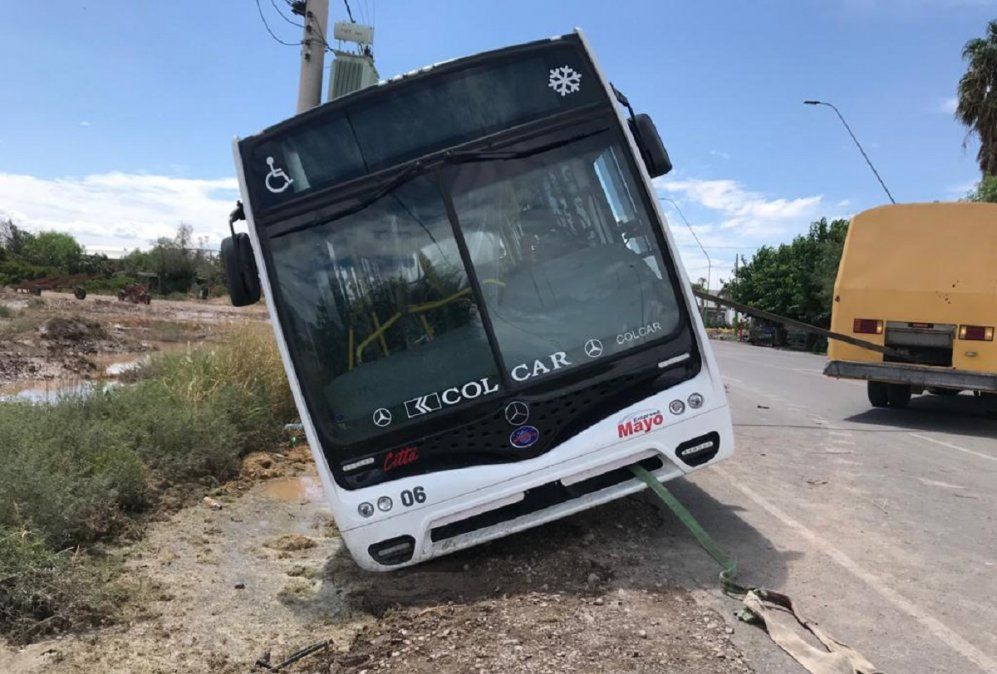 El hecho ocurrió pasadas las 13, en inmediaciones de Joaquín Uñac y Calle 11. Según informaron las fuentes, el chofer frenó el colectivo de la empresa Mayo en la banquina oeste de Joaquín Uñac con el objetivo de girar en “U”. Sin embargo, el terreno cedió ante el peso de la unidad y el colectivo cayó hacia su costado derecho.